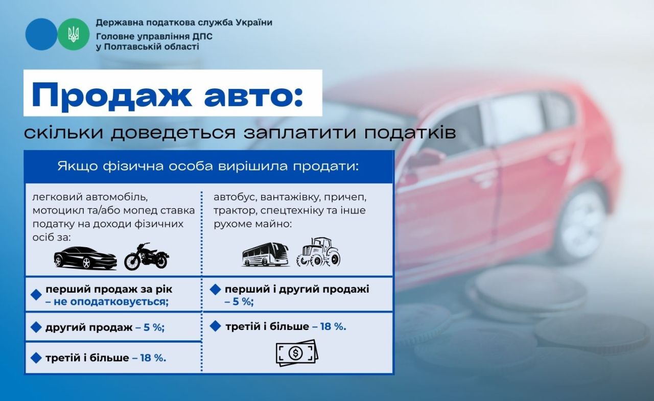 У Головному управлінні ДПС у Полтавській області повідомляють, що громадяни, які вирішили продати власні авто, мають сплатити податки. Ставки податку залежать від типу транспорту та кількості угод протягом року.