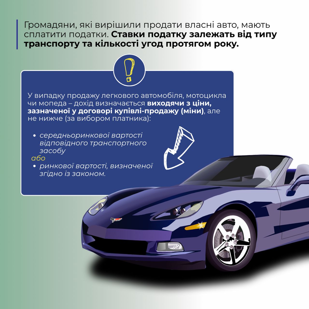 У випадку продажу легкового автомобіля, мотоцикла чи мопеда – дохід визначається виходячи з ціни,  зазначеної у договорі купівлі-продажу (міни), але не нижче (за вибором платника):