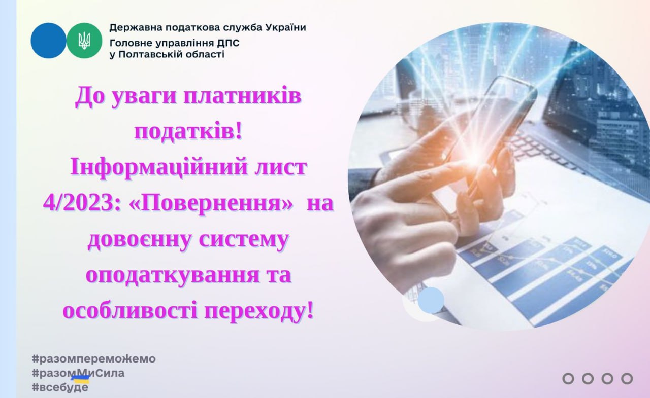 Нещодавно в. о. начальника Головного управління ДПС у Полтавській області Алла Рябкова під час брифінгу в Полтавській військовій адміністрації з представниками Офіційного медіа центру «Новини Полтавщини» повідомила платників податків про набуття чинності Закону України від 30 червня 2023 року № 3219-IX «Про внесення змін до Податкового кодексу України та інших законів України щодо особливостей оподаткування у період дії воєнного стану» (далі – Закон України № 3219-IX).