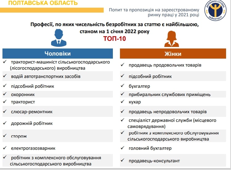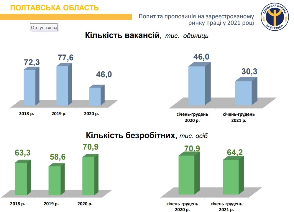 Станом на 1 січня 2022 року послуги Полтавської обласної служби зайнятості отримували 17,9 тисячі зареєстрованих безробітних, що на 36% менше, ніж на цю ж дату минулого року.