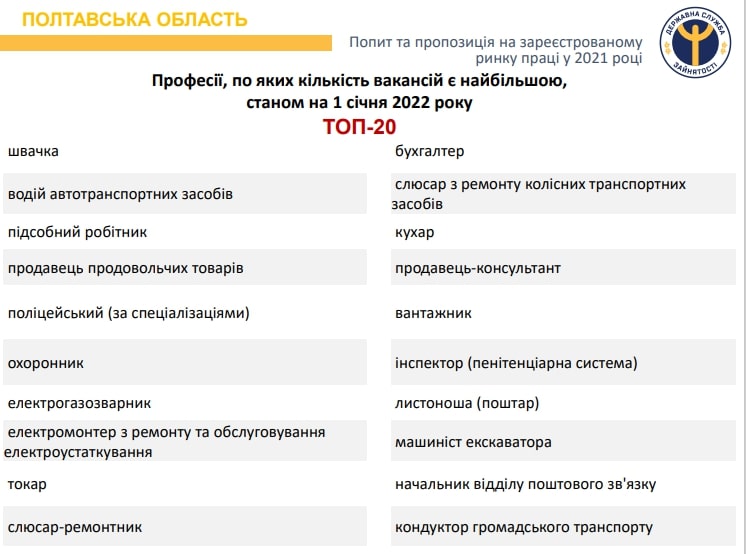 Станом на 1 січня 2022 року роботодавці заявили до Полтавської обласної служби зайнятості становила 1,8 тисячі актуальних вакансій, це на 15% більше, ніж на таку ж дату минулого року.