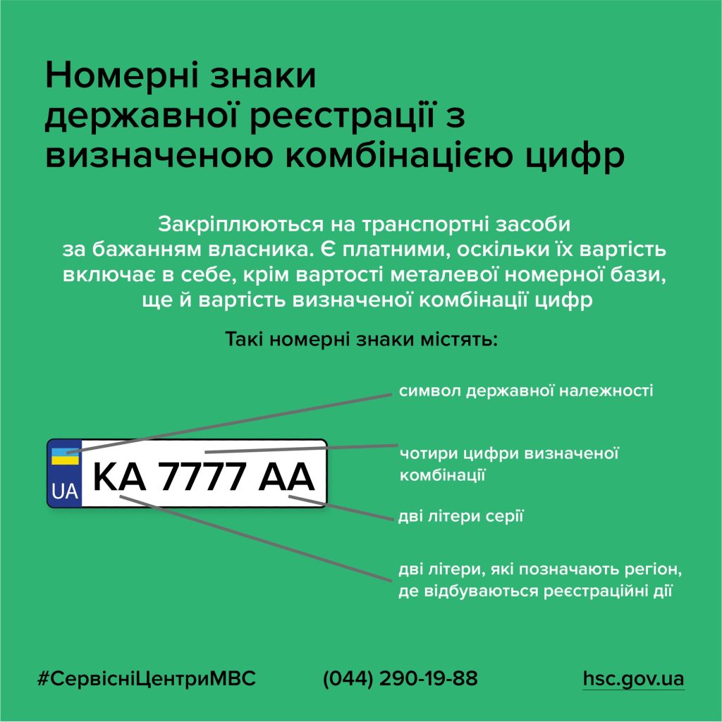 Номерні знаки державної реєстрації із визначеною комбінацією цифр є платними, оскільки їх вартість враховує вартість металевої номерної бази та визначеної комбінації цифр. Платні номерні знаки для легкових авто коштують від 4 800 до 96 000 грн. Зокрема, три однакові цифри не поспіль (наприклад «7077») коштуватимуть 4 800 грн, дві послідовні пари однакових цифр («3344») – 18 000 грн, комбінація з чотирьох одиниць – 60 000 грн, комбінація «0007» – 96 000 грн.