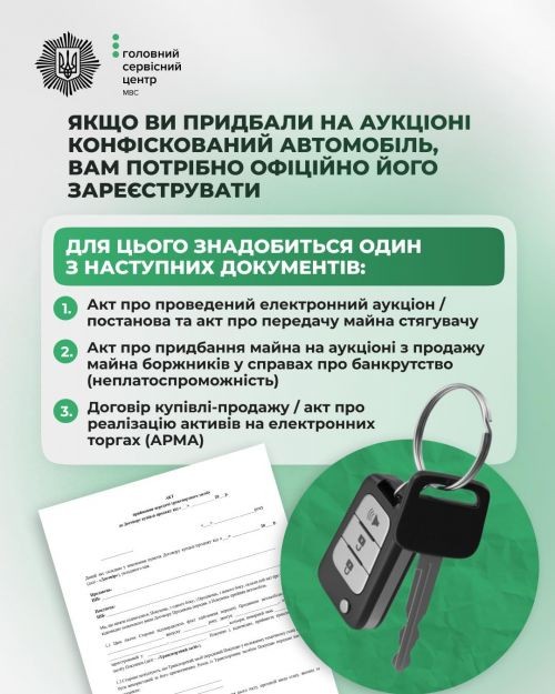 - договір купівлі-продажу транспортного засобу, укладений за результатами прилюдних торгів (аукціону) або електронних торгів, за яким продавцем виступає Національне агентство з питань виявлення, розшуку та управління активами, одержаними від корупційних та інших злочинів (АРМА), або акт про реалізацію активів на електронних торгах, виданий АРМА.