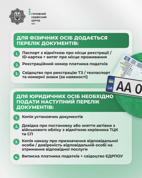 - реєстраційні документи – свідоцтво про реєстрацію транспортного засобу / технічний паспорт та номерні знаки (у разі їх наявності).