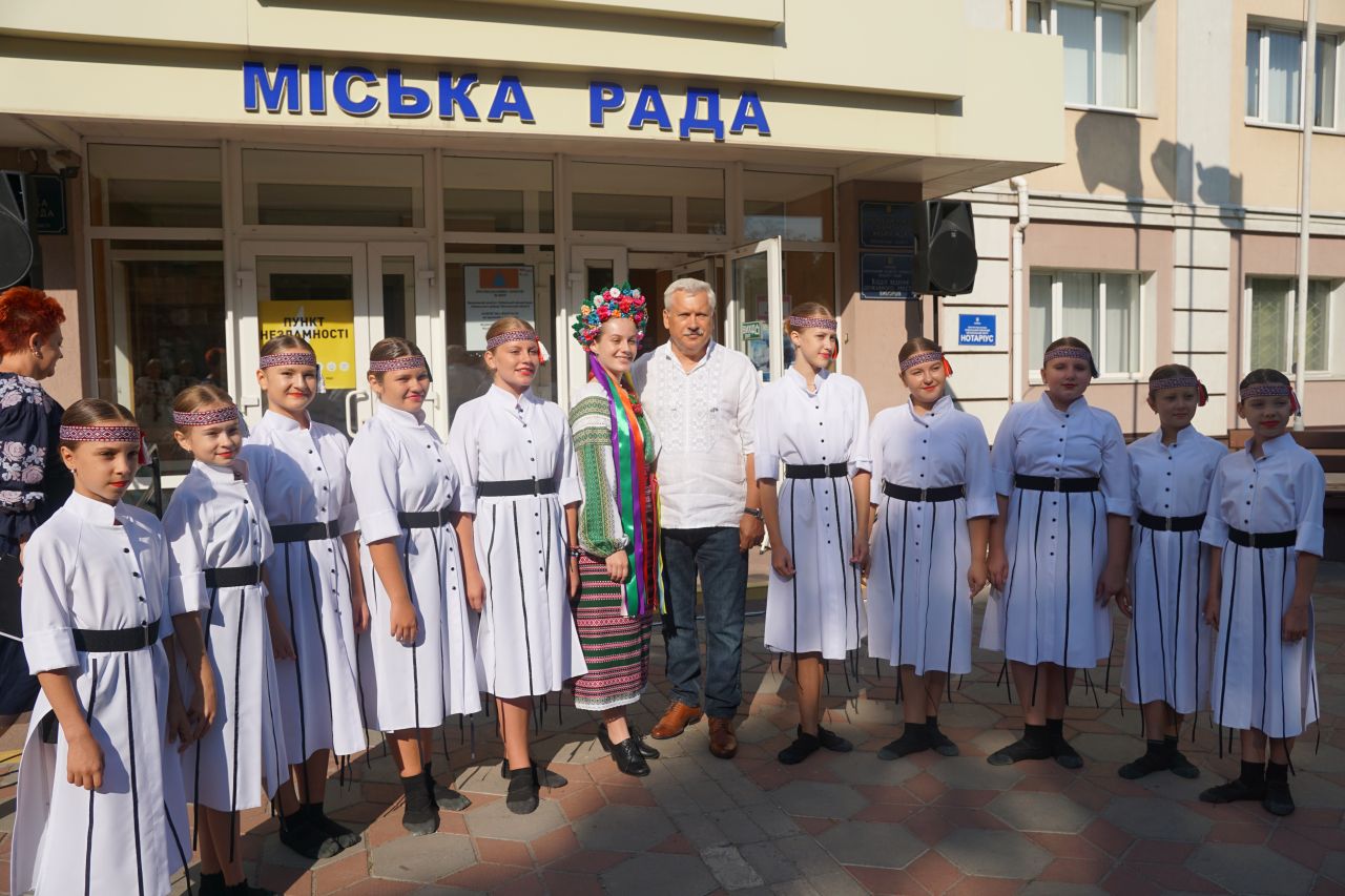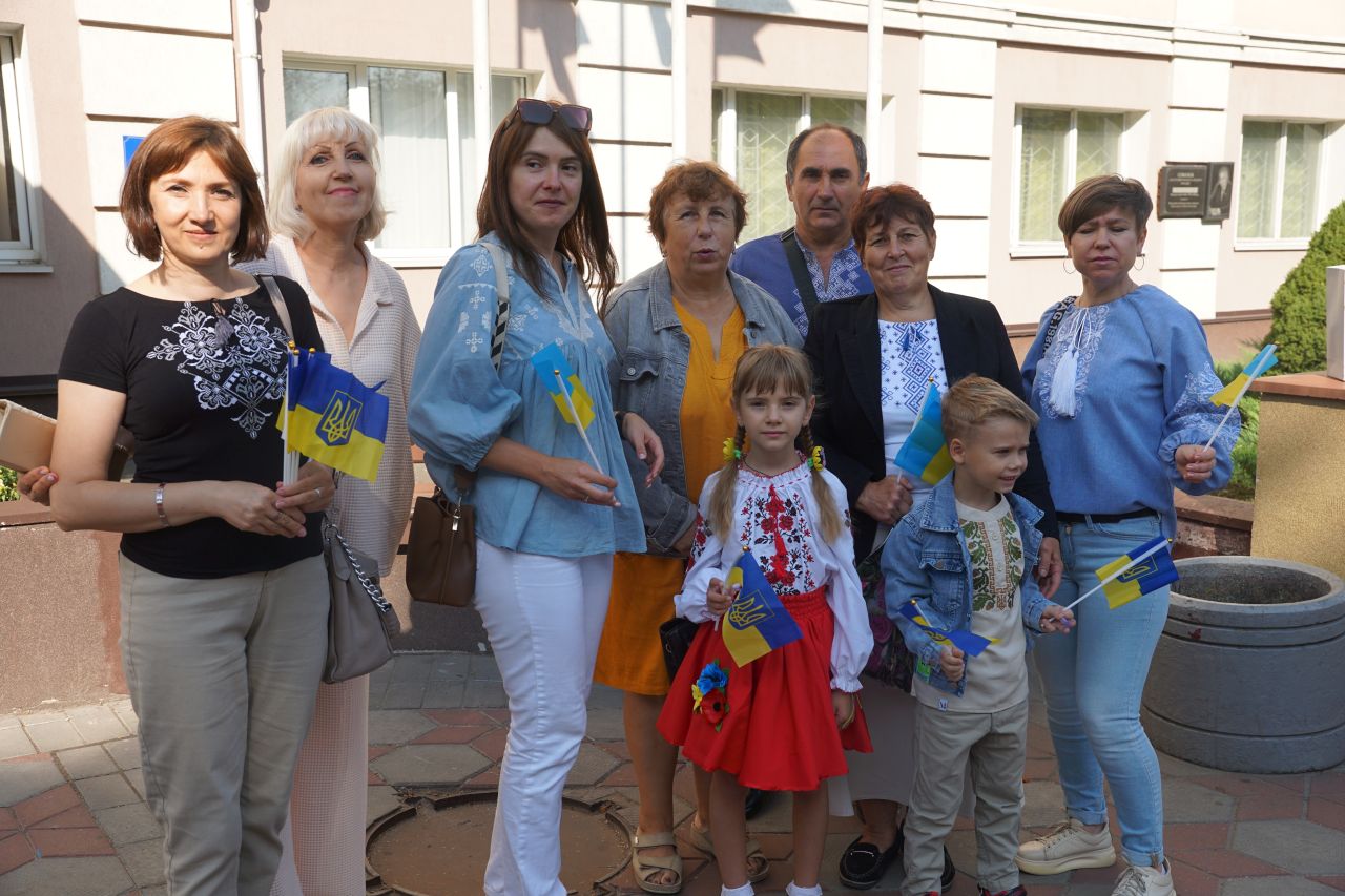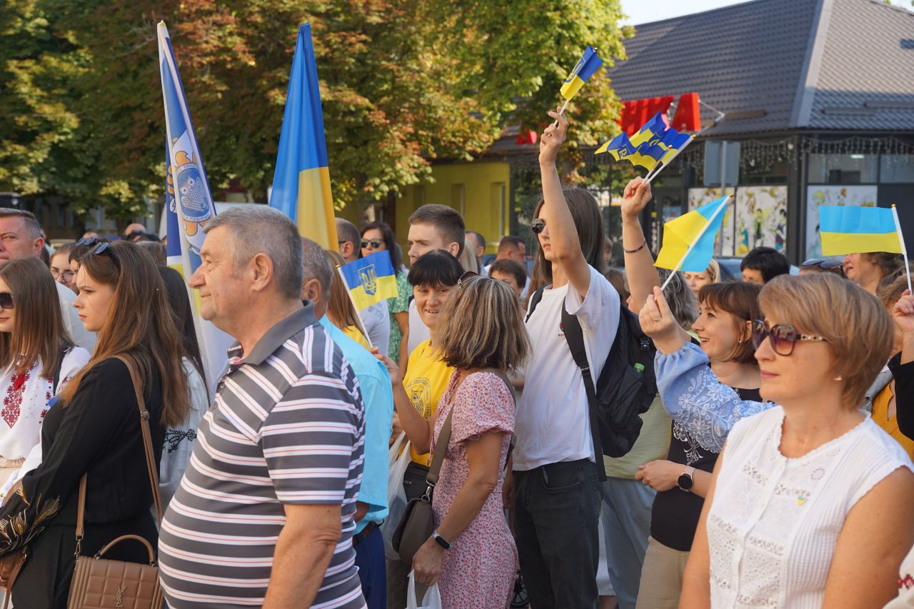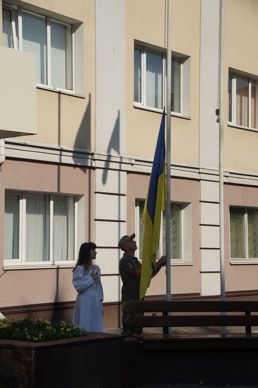«Як і 33 роки тому ми урочисто вшановуємо наш жовто-блакитний стяг, аби гордо він тріпотів у бездонному українському небі, як символ прагнення усього нашого народу до миру, свободи і злагоди», - наголосили у вітальних словах ведучі заходу Софія Кіян, випускниця Академічного ліцею «Європейський» та Іван Ліпатов, одинадцятикласник Академічного ліцею «Європейський».