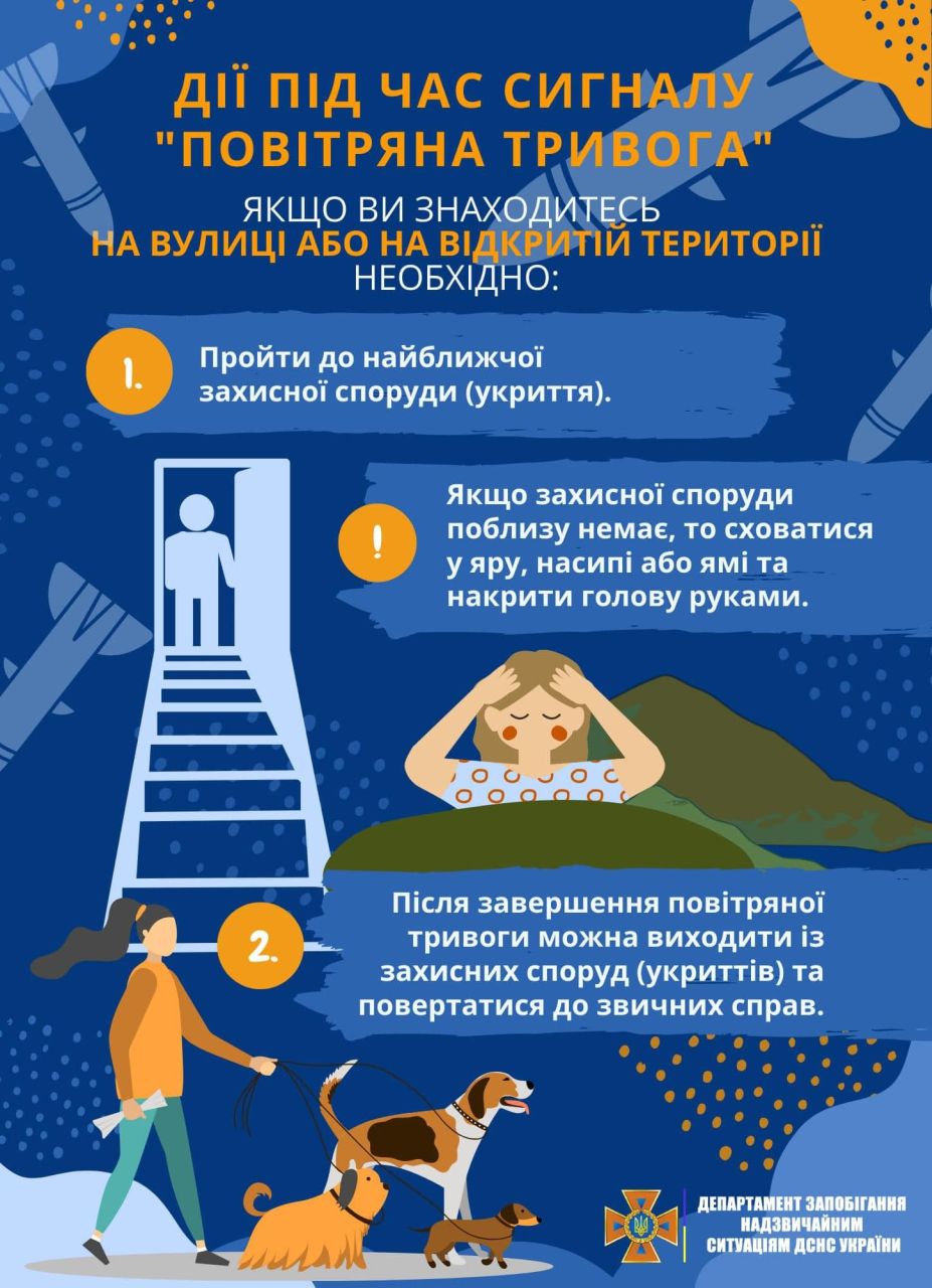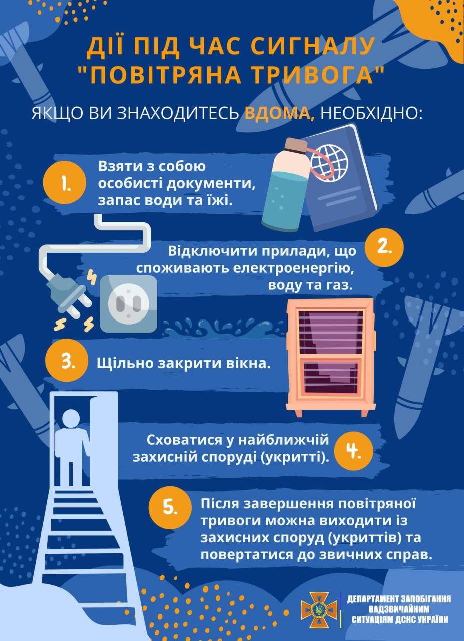 кожному негайно слідувати до найближчого укриття. Для цього завчасно дізнайтеся про місце розміщення укриттів біля вашого будинку чи місця роботи (якщо ви досі ще цього не зробили);