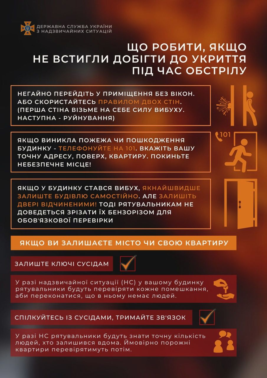 якщо не встигли добігти до укриття негайно перейдіть у приміщення без вікон, скористайтеся правилом “двох стін”;