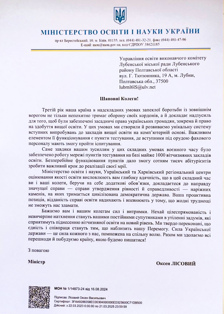 Під час робочої зустрічі директора Харківського регіонального центру оцінювання якості освіти, професора Олександра Сидоренка з Лубенським міським головою Олександром Грицаєнком і начальником Управління освіти Мирославом Костенком було підбито підсумки проведення Національного мультипредметного тестування 2024 року на базі закладів освіти Лубенської територіальної громади та окреслено завдання щодо стоврення належних умов проведення зовнішнього оцінювання у 2025 році. Олександр Сидоренко вручив Лубенському міському голові, колективу Управління освіти і керівникам тимчасових екзаменаційних центрів Тетяні Сергієнко та Світлані Коробицькій листи-подяки від Міністра освіти і науки України Оксена Лісового і Харківського РЦОЯО за належну підготовку пунктів тестування та високий організаційний рівень проведення процедури НМТ-2024.