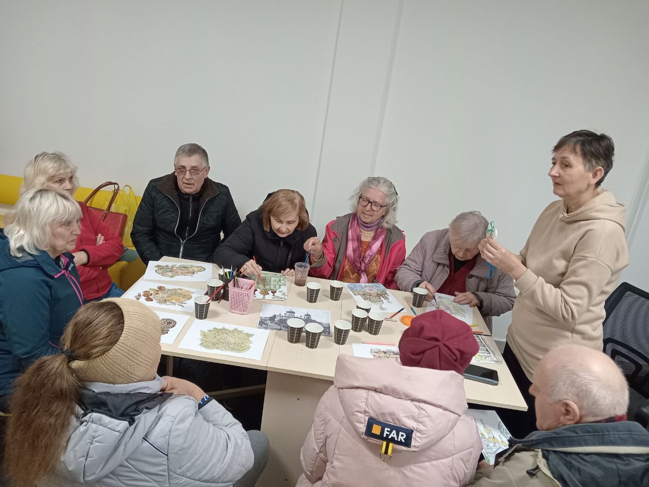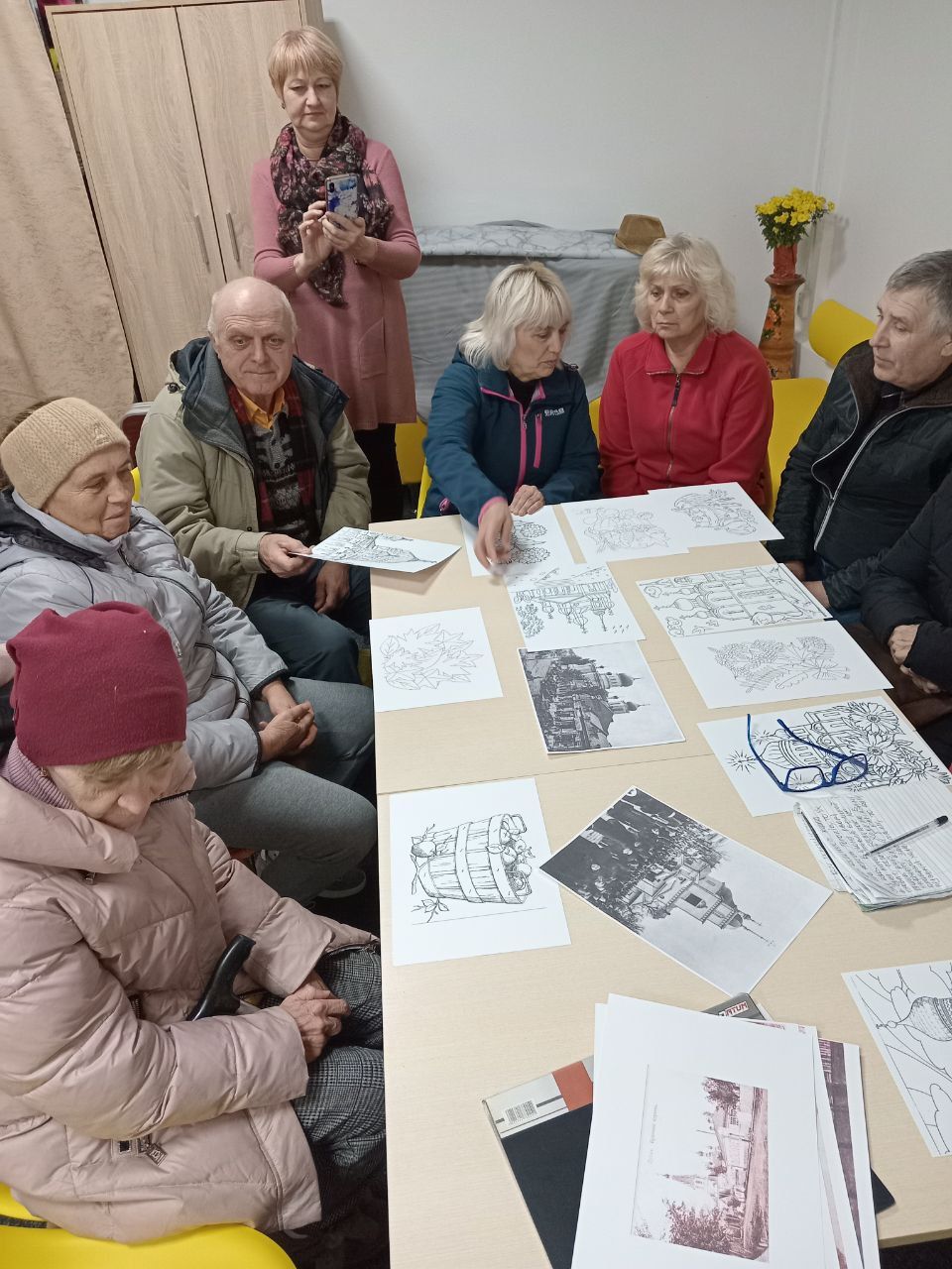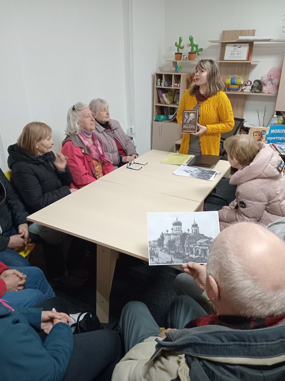 Цього разу зустріч мобільної бібліотеки охопила краєзнавчу мозаїку нашого краю. Бібліотекар Марина Кононенко ознайомила присутніх з історією міста, зокрема, походженням назв його вулиць, ілюструючи свою розповідь ретро-світлинами храмів Лубен, та спинилася на тематиці історичних романів Володимира Малика. А бібліотекар Лариса Гончарук провела майстерку "Малюємо кавою", запропонувавши поважним слухачам розмалювати не лише натюрморти, а й архітектурні цікавинки – церкви. Малювати кавою — це поєднати ніжний живопис із великою кількістю тепло-золотих відтінків й акварельних ефектів. Одна з найароматніших програм арттерапії, що чудово розвантажує, знімає стрес та створює позитивний настрій.