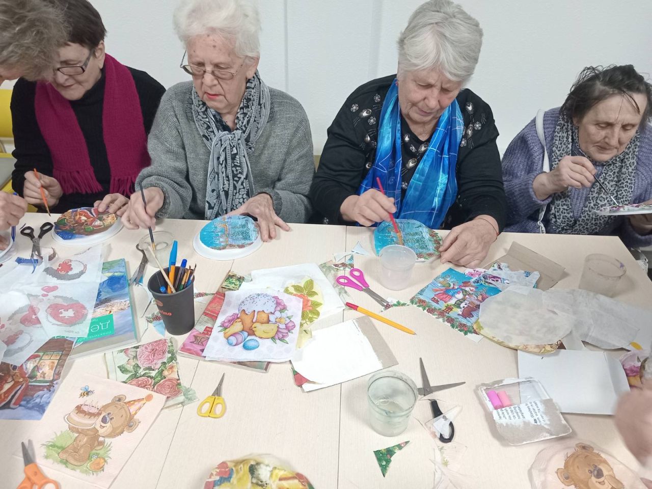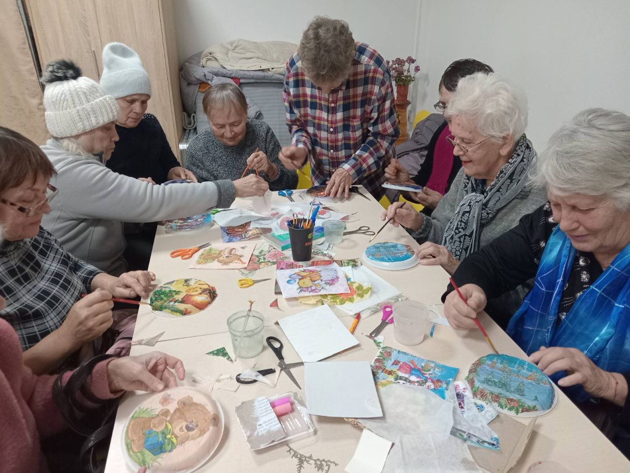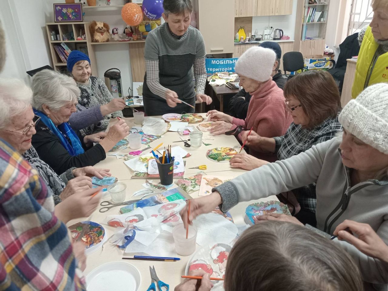 Логічним продовження зустрічі стало арттерапевтичне заняття «Декупаж – креативна техніка для хобі». Під час майстер-класу, який провела бібліотекар Лариса Гончарук, присутні виготовили власноруч новорічні прикраси з пластикових тарілок та декупажних серветок. Творче заняття подарувало людям гарний настрій та передчуття чарівних новорічних свят.