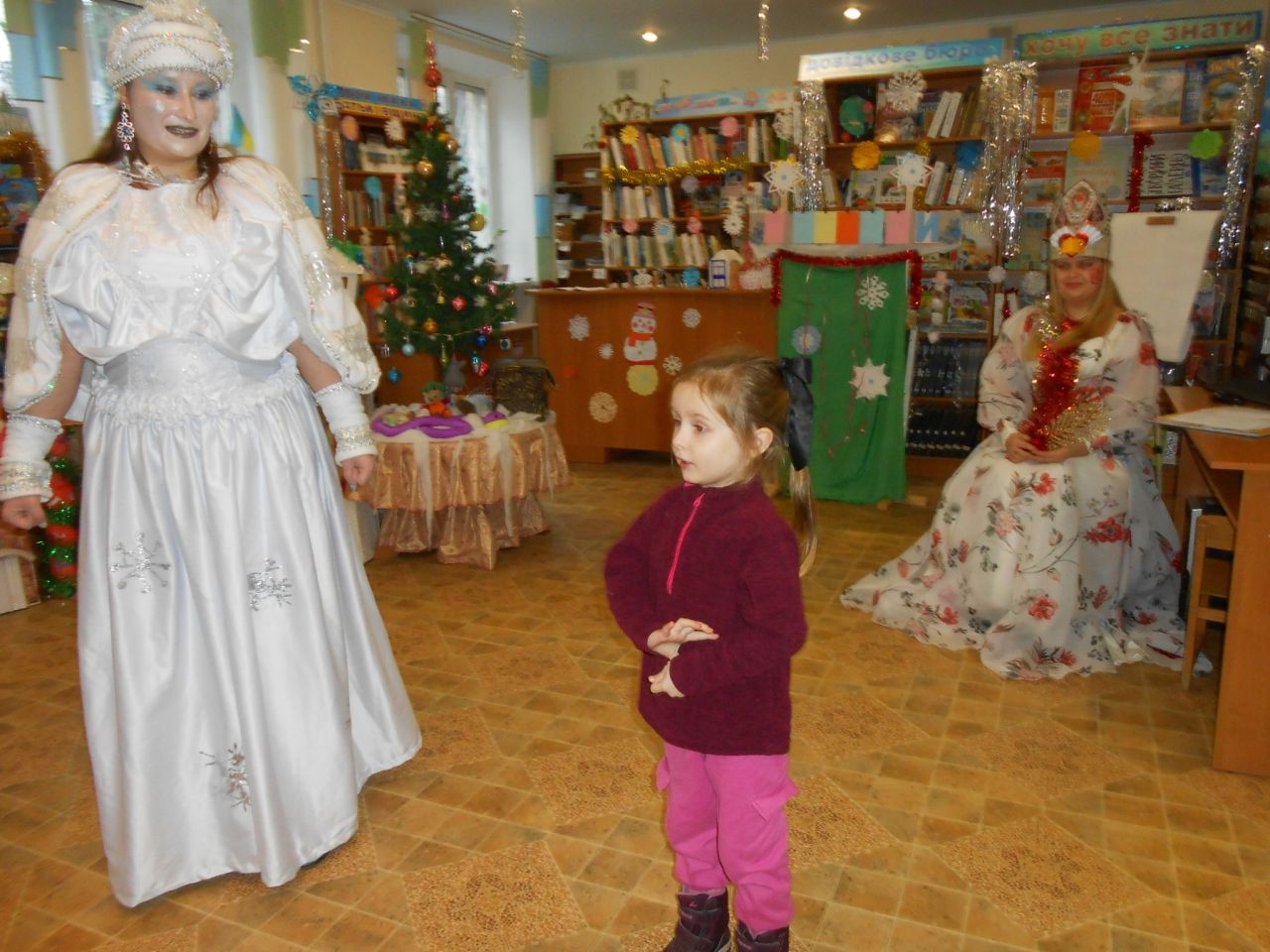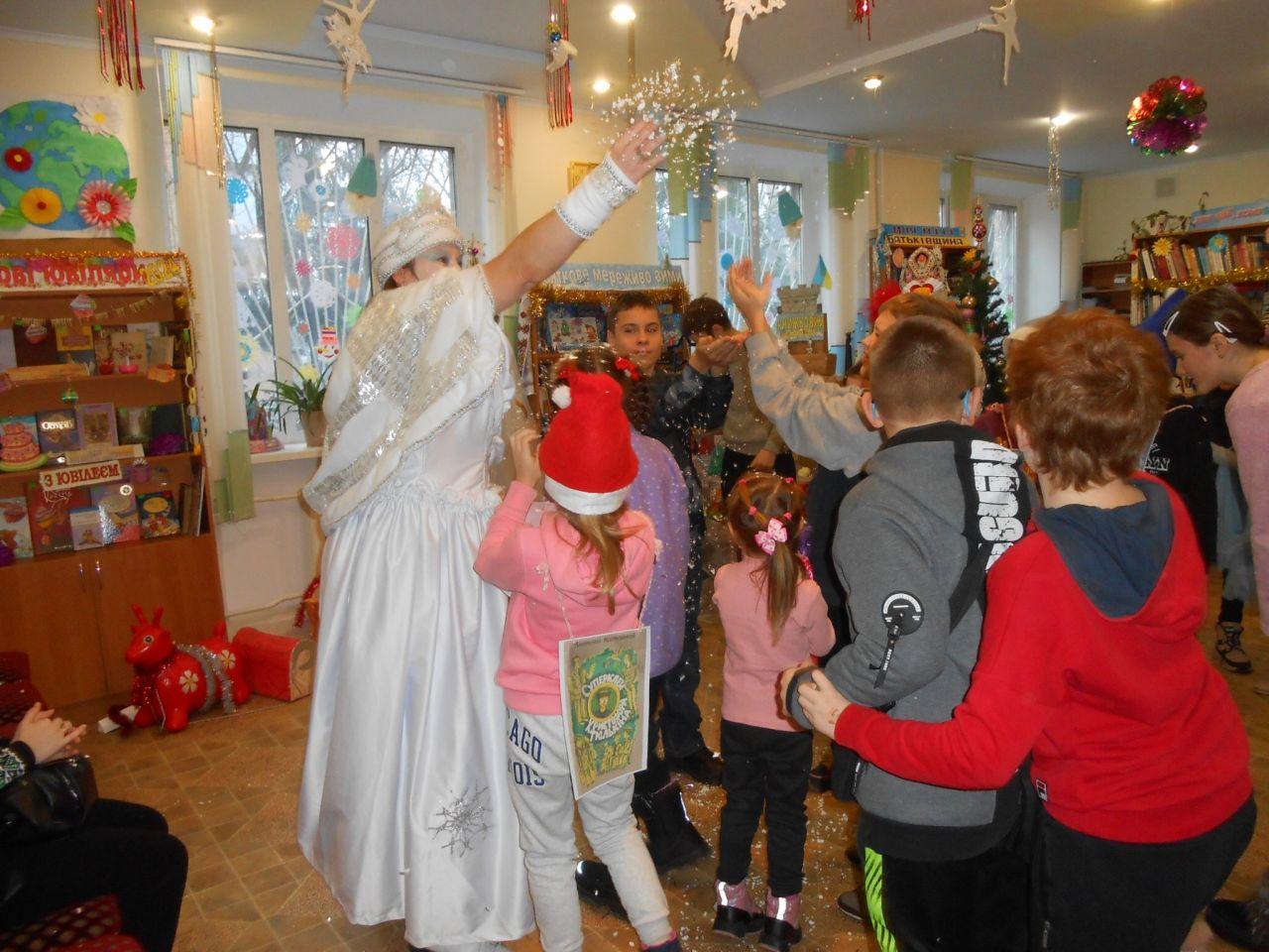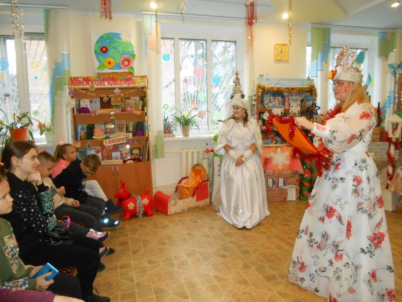 В гості до Книжкового Палацу завітала пані Снігова Королева, та ще й не сама, а зі своєю помічницею – Тролькою. Їх радо зустріла Королева Книг. Та незважаючи на гостинність, Снігова Королева весь час намагалась все і всіх заморозити. Знання дітьми казок, віршів, відгадування загадок від Холодної гості, усмішки та тепло сердець, не давали їй цього зробити. Всі випробування, які підготувала Королева Холоду, діти вправно виконували: залюбки гралися в магічні ігри, називали літературні твори за поданими словами-асоціаціями, відгадували казкових героїв за уточнювальними запитаннями, рухались, виконуючи різні цікаві завдання. А вигадлива Тролька теж не лишилась осторонь. Щоб якось допомогти Сніговій Королеві, вона пропонувала дітям свої завдання: утворити нові слова на кожну літеру даного слова, намалювати зимового персонажа із закритими очима, приклеїти ніс Сніговику… Чого тільки не вигадували гості із Крижаного королівства, аби Книги-ювіляри залишились у них. Але, дитяча кмітливість, розум, літературна обізнаність, розтопили крижані чари. Нічого не лишалось Сніговій Королеві, як повернути книги до Книжкового Палацу. І свято продовжилось в піднесеному святковому настрої зі смачним частуванням.
