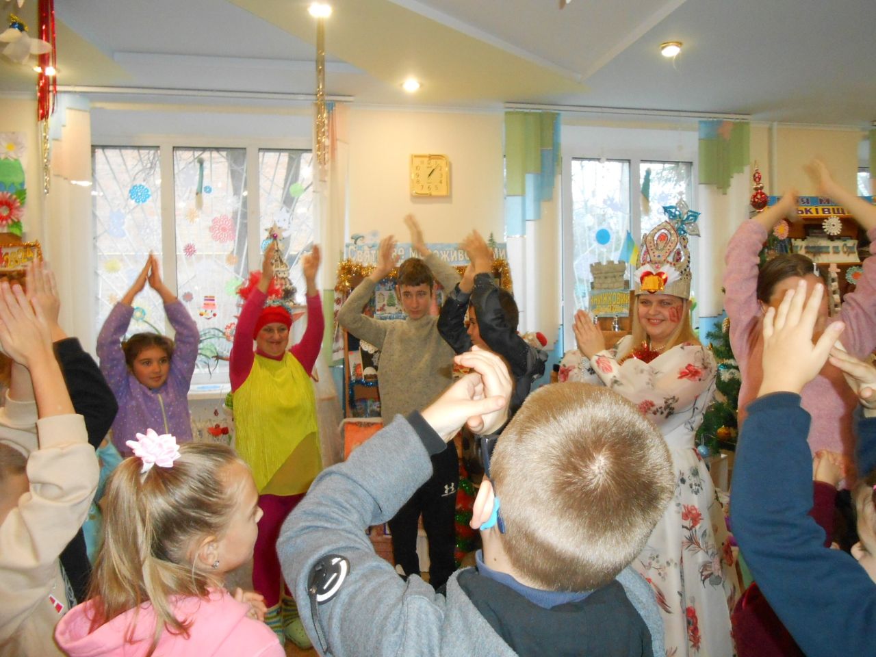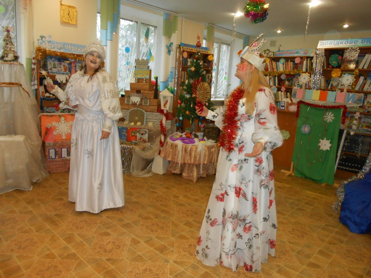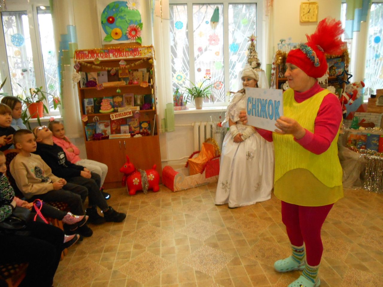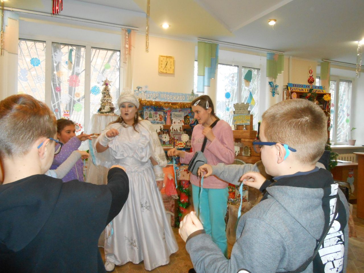 В гості до Книжкового Палацу завітала пані Снігова Королева, та ще й не сама, а зі своєю помічницею – Тролькою. Їх радо зустріла Королева Книг. Та незважаючи на гостинність, Снігова Королева весь час намагалась все і всіх заморозити. Знання дітьми казок, віршів, відгадування загадок від Холодної гості, усмішки та тепло сердець, не давали їй цього зробити. Всі випробування, які підготувала Королева Холоду, діти вправно виконували: залюбки гралися в магічні ігри, називали літературні твори за поданими словами-асоціаціями, відгадували казкових героїв за уточнювальними запитаннями, рухались, виконуючи різні цікаві завдання. А вигадлива Тролька теж не лишилась осторонь. Щоб якось допомогти Сніговій Королеві, вона пропонувала дітям свої завдання: утворити нові слова на кожну літеру даного слова, намалювати зимового персонажа із закритими очима, приклеїти ніс Сніговику… Чого тільки не вигадували гості із Крижаного королівства, аби Книги-ювіляри залишились у них. Але, дитяча кмітливість, розум, літературна обізнаність, розтопили крижані чари. Нічого не лишалось Сніговій Королеві, як повернути книги до Книжкового Палацу. І свято продовжилось в піднесеному святковому настрої зі смачним частуванням.