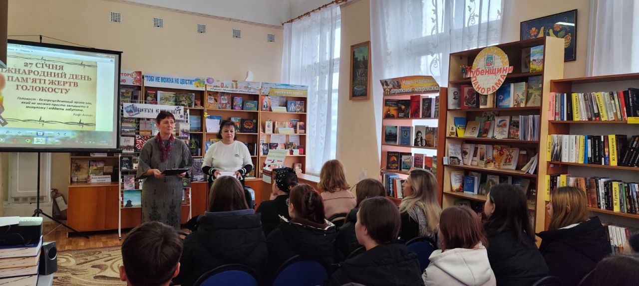 З цієї нагоди працівники Лубенської публічної бібліотеки імені Володимира Малика провели годину пам’яті про незабутні уроки історії. Ведучі заходу Лариса Гончарук та Сніжана Кириченко ознайомили учнів 9 класу Української класичної гімназії та ліцеїстів 10-Г Академічного ліцею «Європейський» з трагічними подіями нашого минулого. Уривок зі щоденника єврейської дівчинки Анни Франк зачитала Інна Сизоненко. Також демонструвався буктрейлер до роману «Крадійка книжок» письменника Маркуса Зузака. А гість заходу - науковий співробітник Лубенського краєзнавчого музею імені Гната Стеллецького Тетяна Сафронова, поінформувала про долі лубенців, які вижили в жахливому яру та про людей, які їм допомагали. Письменниця Ганна Кревська, базуючись на архівних матеріалах знищення лубенських євреїв у Засульському яру, зачитала уривок зі своєї повісті «Коржики».