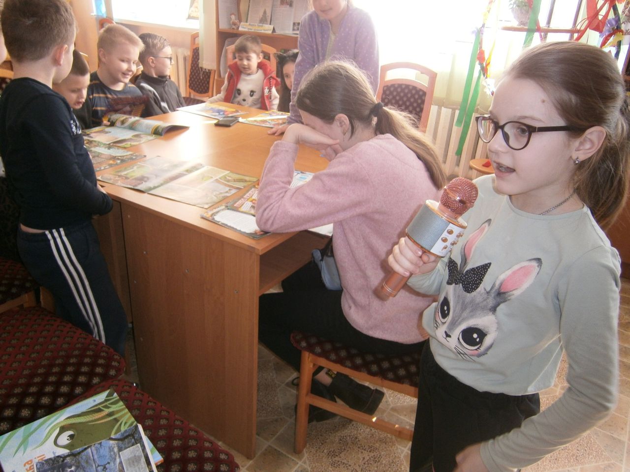 У невимушеній дружній атмосфері слухали цікаві розповіді про зміни, які відбуваються в природі на початку весни: про птахів, які прилітають, про тварин, які прокидаються від зимового сну, про перші квіти. Діти із захопленням коментували та ділилися враженнями про навколишнє, розповідали цікаві пригодницькі історії з власного життя. А щоб більше дізнатися про життя незвичайних тварин, читайликам було запропоноване завдання «Найкумедніша презентація». У журналах «Смайлик» діти повинні були спочатку знайти цікаву статтю про тваринку, ознацомитися з нею, а потім, використовуючи мікрофон, якнайцікавіше охарактеризувати незвичайного мешканця. Після дитячих розповідей, виконали тест «Яка ти тваринка», малювали тваринок майбутнього та грали в гру «Хто я», а ще відгадували незвичайні загадки із книги С.Дерманського "Лізла жаба по драбині".