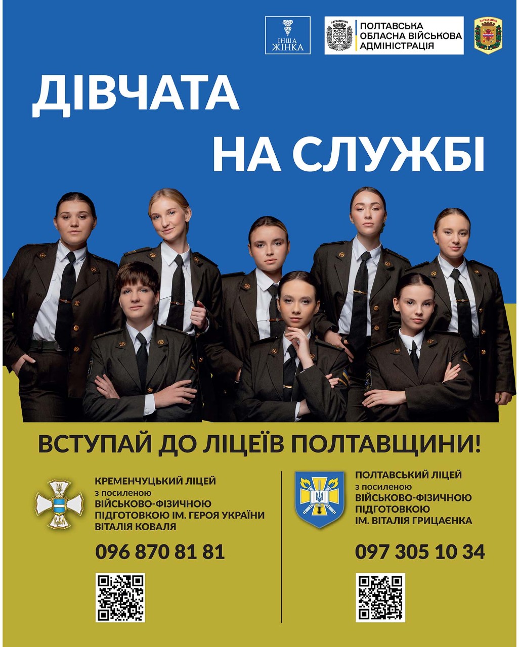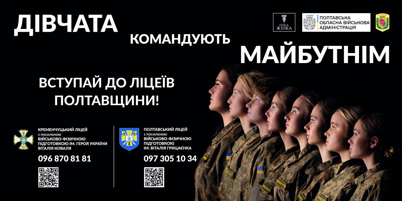 воюють, лікують, командують. Вони – опора України. Тому ми оголошуємо набір дівчат до ліцеїв Полтавщини. Бо сміливість – це не про стать, а про вибір. У наших ліцеях не просто навчають. Це школа лідерства, характеру, відповідальності. Сміливі – серед нас. Полтавщина підтримує та створює умови для навчання й вишколу кожної та кожного, хто готовий служити Україні з розумом, честю та гідністю.
