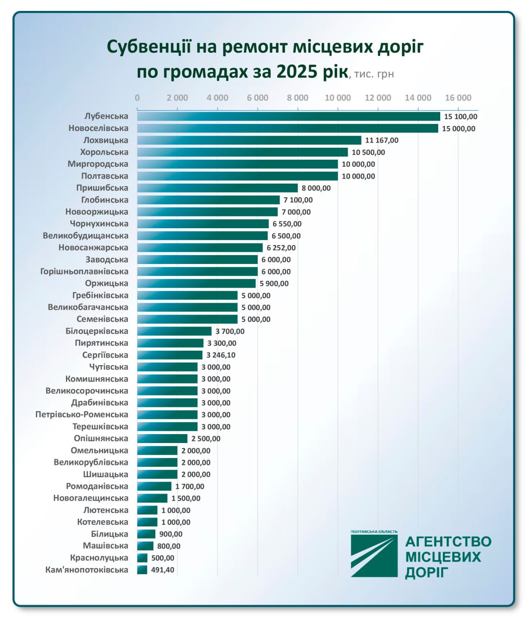 Кошти спрямовують територіальні громади, які й обирають дороги для ремонту. Серед громад Полтавщини у фінансуванні ремонту доріг лідирує Лубенська міська територіальна громада, перерахувавши на ці потреби 15,1 млн. грн.