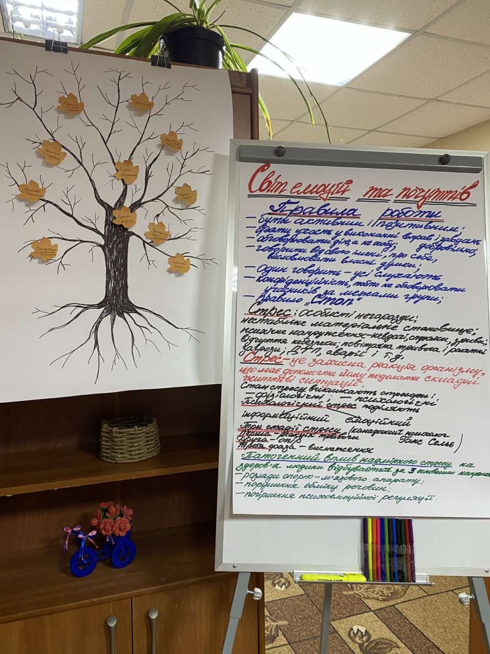Присутні практикували різні прийоми реаксації, спрямовані на зменшення страху і стану підвищеної тривожності. Підсумком тренінгу стали гарний настрій та позитивні емоції, а також щира вдячність модераторам за змістовний курс теоретичних знань та практичних навичок.