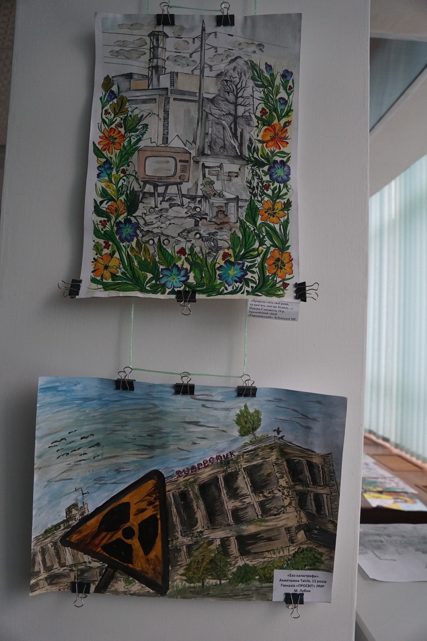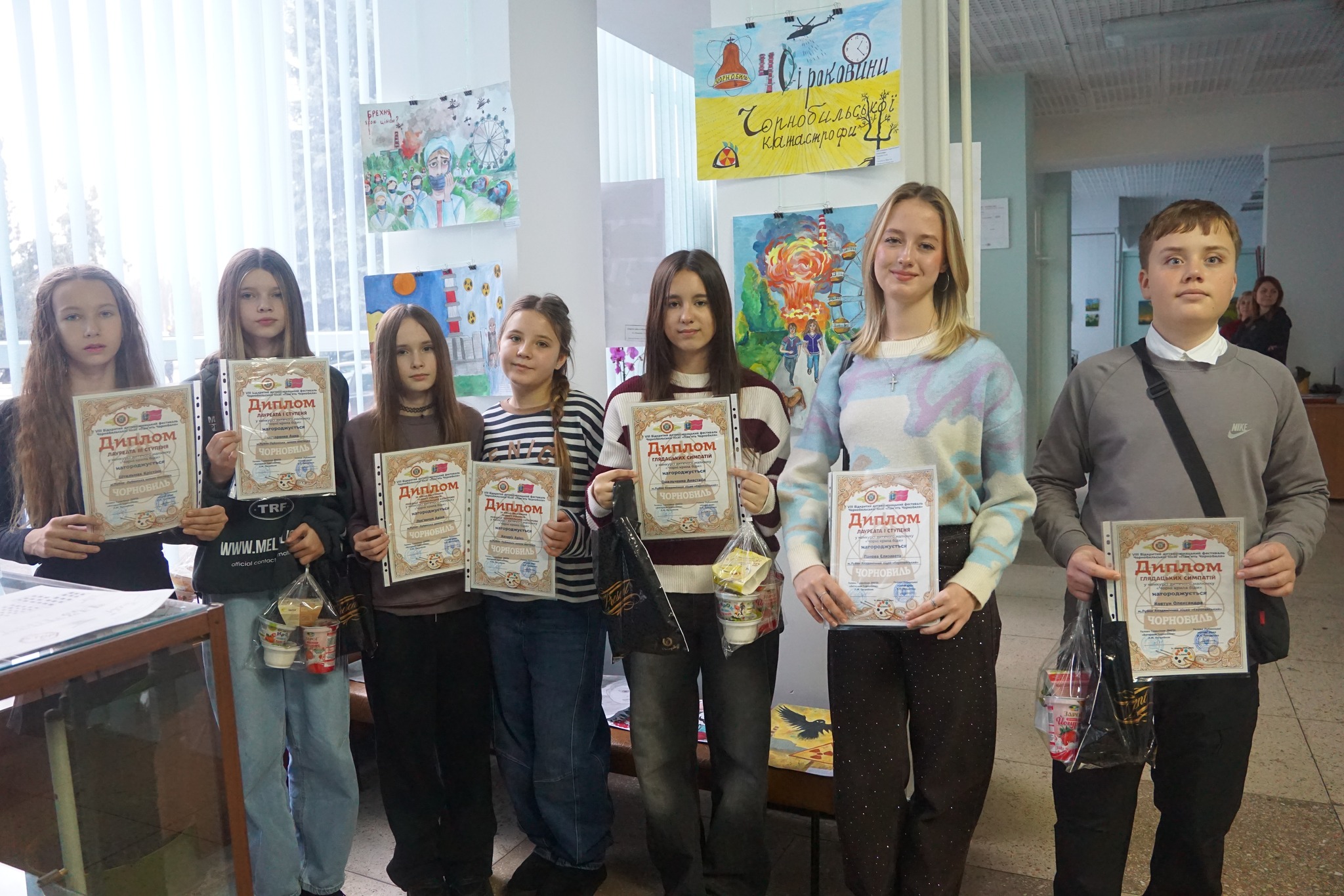 На стінах галереї дитячі малюнки – погляд юного покоління на подію, що змінила світ, дитяча щирість, яку не приховаєш. Кожна дитяча робота – пам’ять про Чорнобиль. Бажання молоді бачити Україну без трагедій, а українців - щасливими.