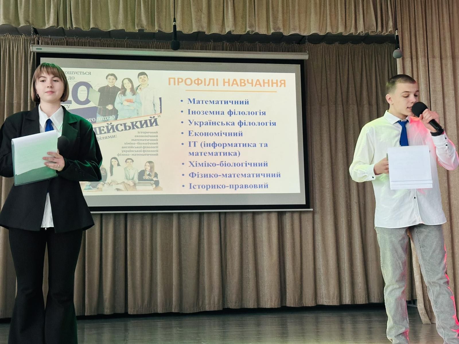 Директорка ліцею Лариса Деркач ознайомила гостей з профілями, за якими надаються освітні послуги у старшій школі та надала вичерпні відповіді на всі запитання щодо організації навчання та перспектив особистісного зростання майбутніх десятикласників.