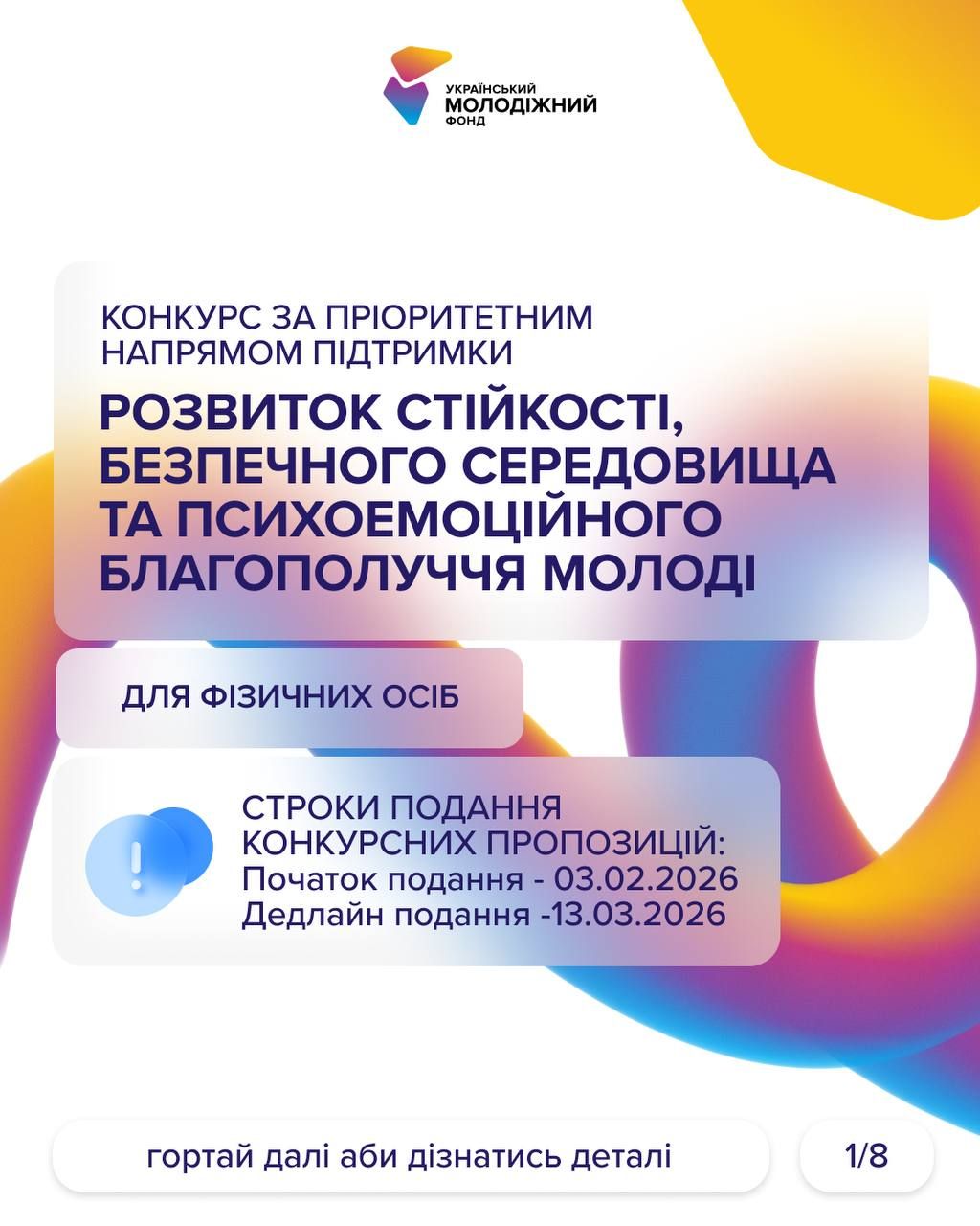 Конкурс за пріоритетним напрямом «Розвиток стійкості, безпечного середовища та психоемоційного благополуччя молоді» для фізичних осіб реалізується Міністерством молоді та спорту України і Українським молодіжним фондом.