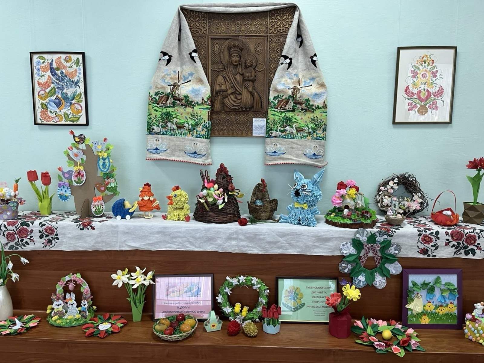 Виставка вражає своїм розмаїттям: рушники, ікони, українське вбрання, вишиті в різних техніках картини, аксесуари і,звичайно ж, великодні писанки.