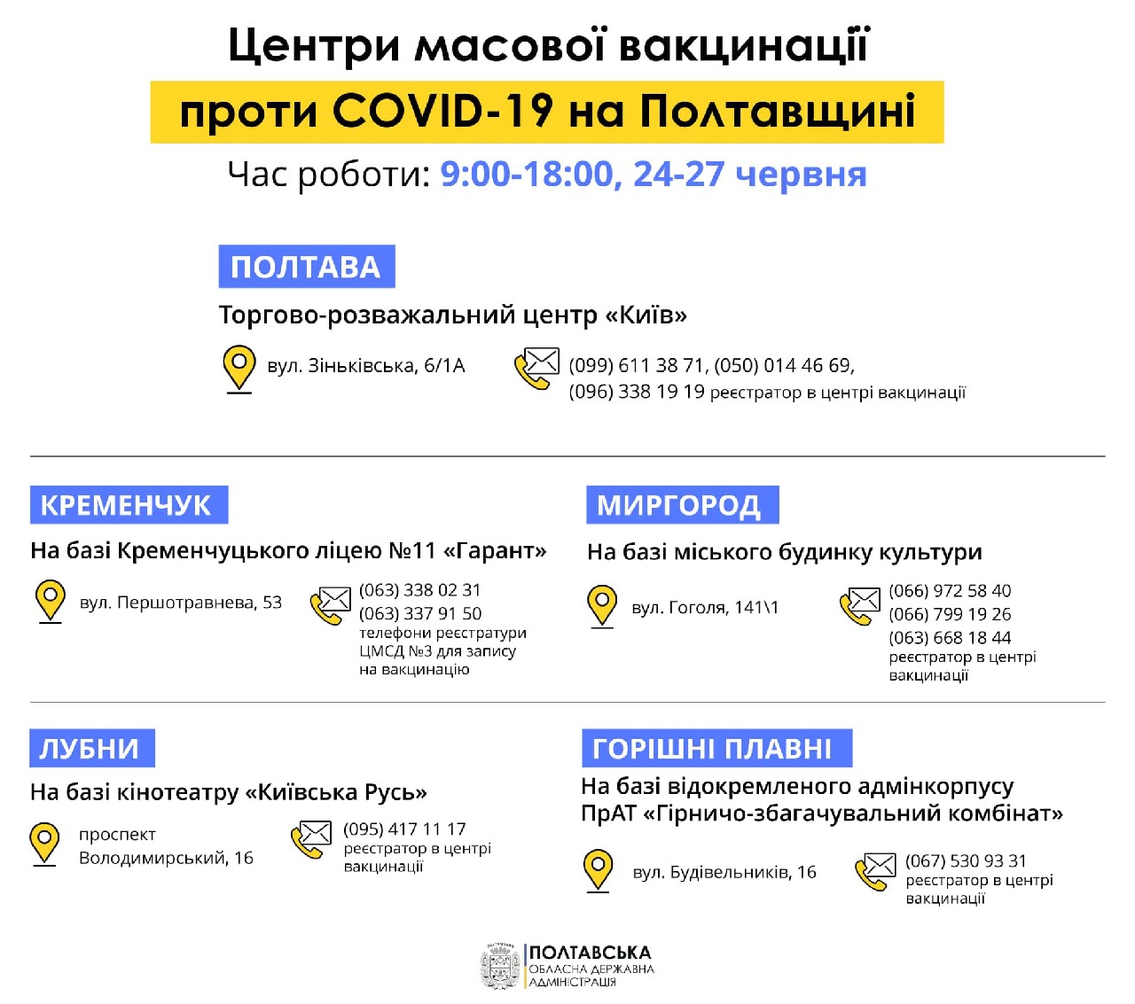 Повідомляємо вам що 26.06. та 27.06.2021 року в приміщенні амбулаторії сімейної медицини №4, яка знаходиться за адресою Метеорологічна 24/2, буде проводитись щеплення вакциною від COVID-19 виробництва Пфайзер, Бельгія. Пріоритетні групи населення які отримають щеплення від коронавірусної хвороби : медпрацівники, військовослужбовці, педагоги, держслужбовці, працівники критично важливих структур безпеки України. Також буде проводитись вакцинація залишковими дозами. Графік роботи пункту щеплення 26.06.20.2021 року з 8.00 до 17.00., 27.06.2021 з 8.00 до 12.00.