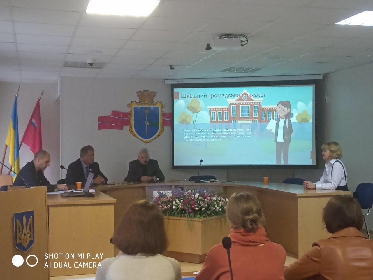 Голова цієї громадської організації Олексій Коваленко та експерти Максим Лукінюк і Марія Акуленко розповіли, що загалом в Україні лише 12 територіальних громад працюють над впровадженням ШГБ за стандартами ПРООН. Також гості проаналізували нашу Програму Громадського бюджету та Положення про шкільний громадський бюджет. Відзначили успіхи у цьому напрямку нашої громади та подякували Олександру Петровичу за підтримку таких ініціатив серед учнівської молоді.