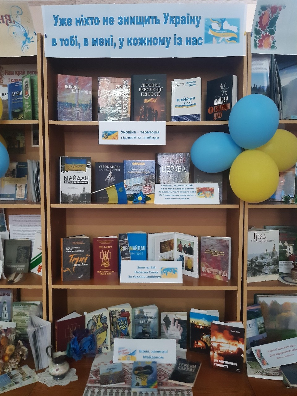 Героїчним та трагічним подіям 2013 – 2014 років на Майдані Незалежності присвячена патріотична книжкова виставка «Уже ніхто не знищить Україну в тобі, в мені, у кожному із нас!».