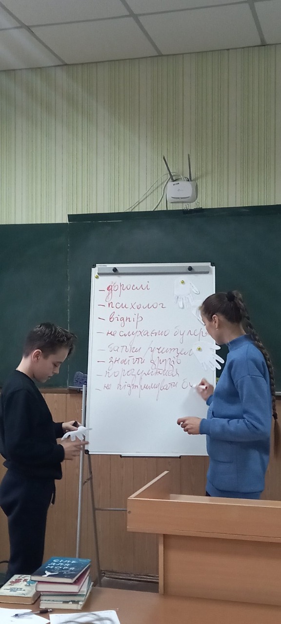 Розібравшись, що таке булінг, дітям запропонували зробити «руку допомоги» - написати на паперовій долоньці, як можна йому запобігти та допомогти дитині, яку цькують. Останнім був «мозковий штурм»: усі разом ще раз продумали стратегію допомоги постраждалим від булінгу. А саме: не соромитися, якщо вас цькують, намагатися порозумітися із булером, звертатися за допомогою до дорослих (батьків, учителя, брата, психолога), поліції, дзвонити на гарячу лінію. Якщо ж ви свідок боулінгу – висловити свою позицію, підтримати постраждалого, висловити осуд булеру, повідомити дорослих.