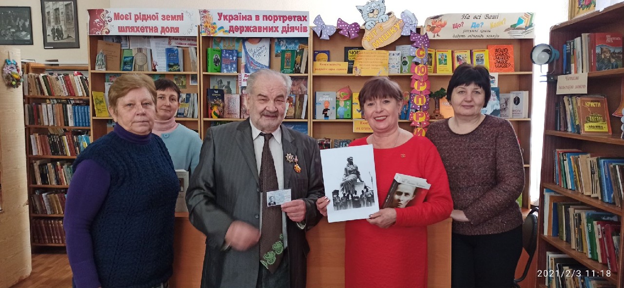 На цій світлині працівники Лубенської центральної бібліотеки імені Володимира Малика разом з Миколою Босенком та фото проміжної моделі з гіпсу пам’ятника Лесі Українці.