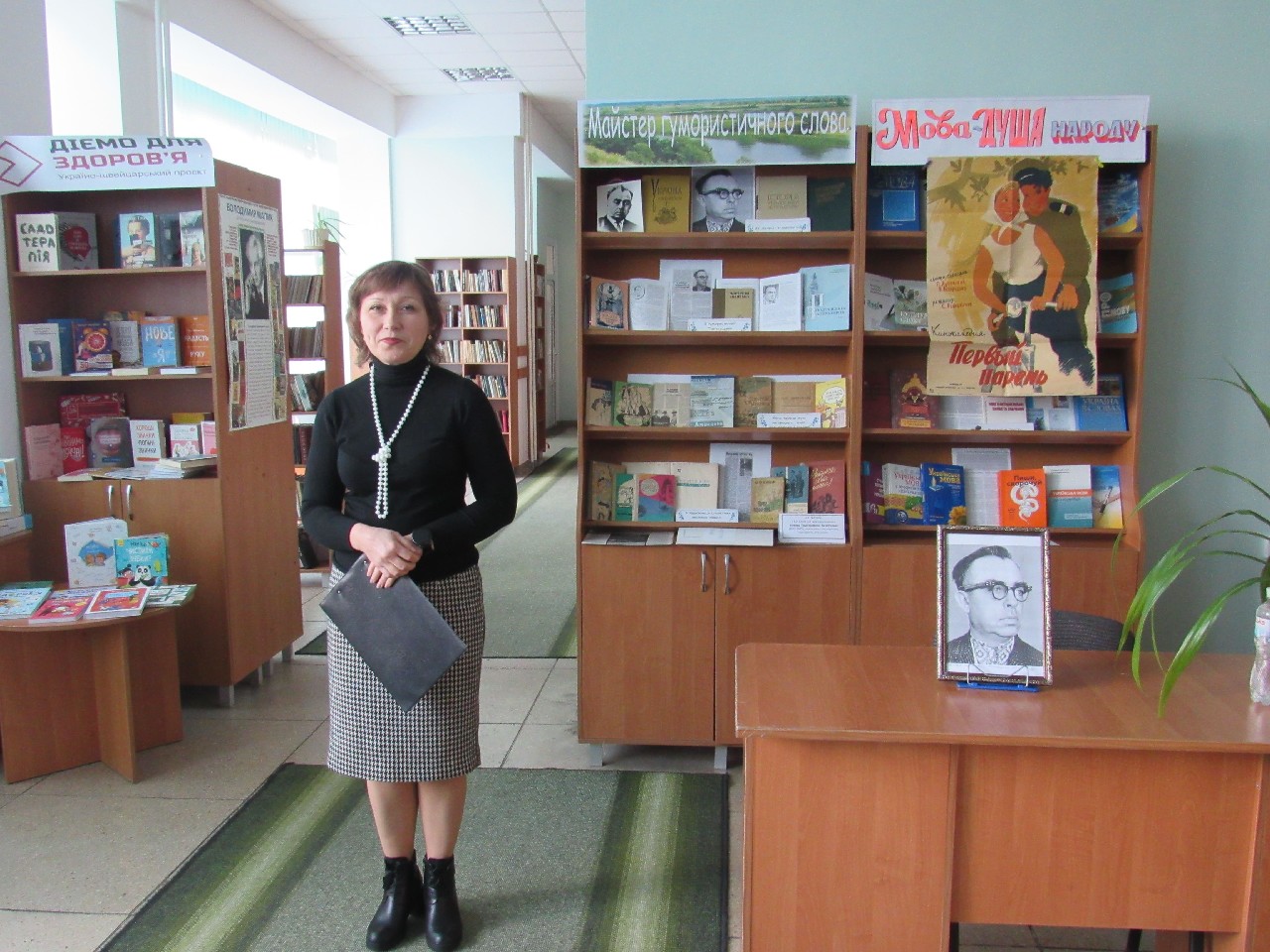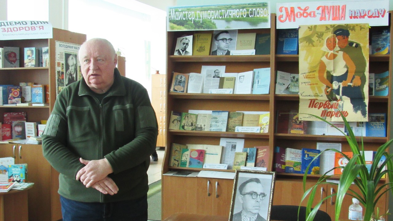 Бібліотекар Юлія Давиденко, модератор заходу, ознайомила з біографічним шляхом відомого лубенця, презентувавши загалу світлини пам'ятних моментів життя гумориста.