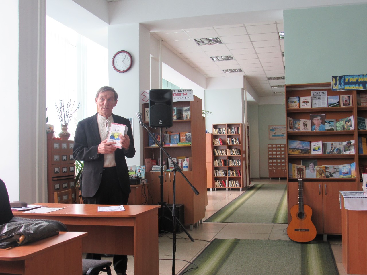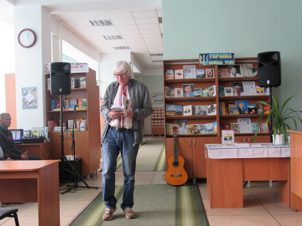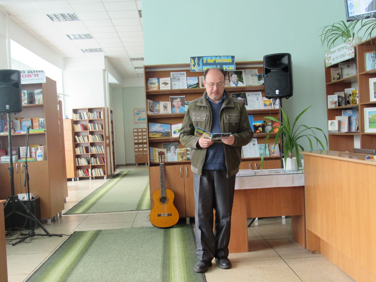 Олег Бородай порадував публіку патріотичними піснями гри на гітарі як власного авторства, так і на слова побратимів – військовослужбовців. Розповів і про фронт: воює зараз на Бахмутському напрямку. Поет, що стоїть на захисті України, подарував книгозбірні свою прозову книгу на воєнну тематику «Вогневий вал». Навзаєм завідувачка книгозбірні Світлана Голуб побажала йому подальшої плідної реалізації невичерпного творчого потенціалу.