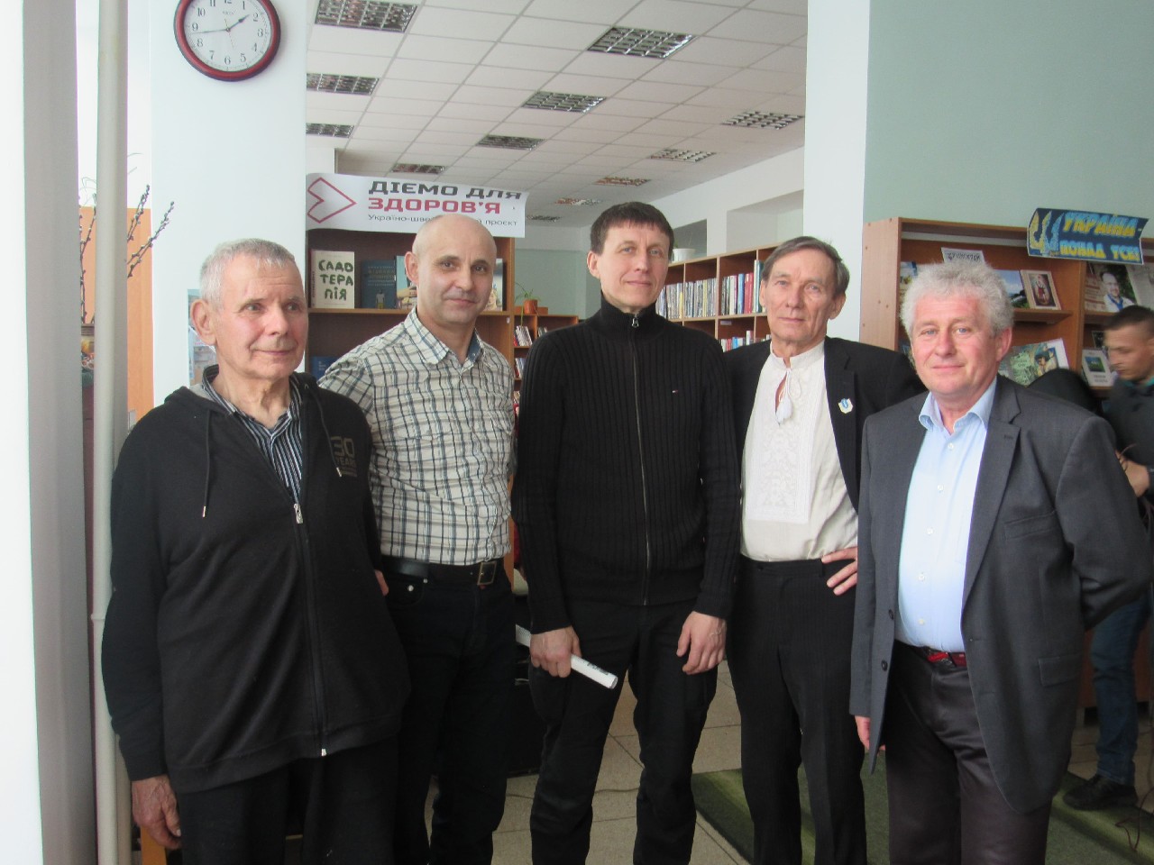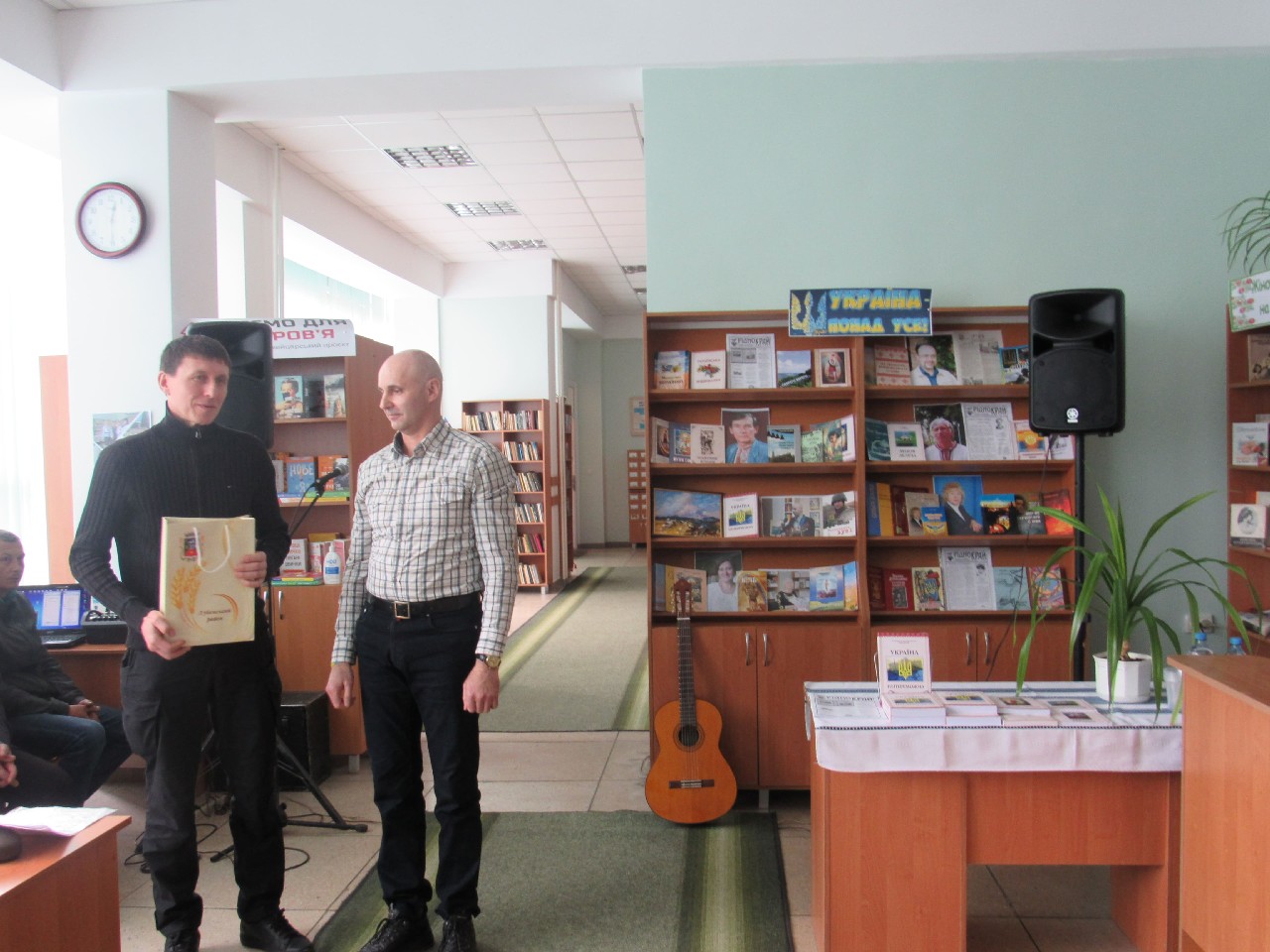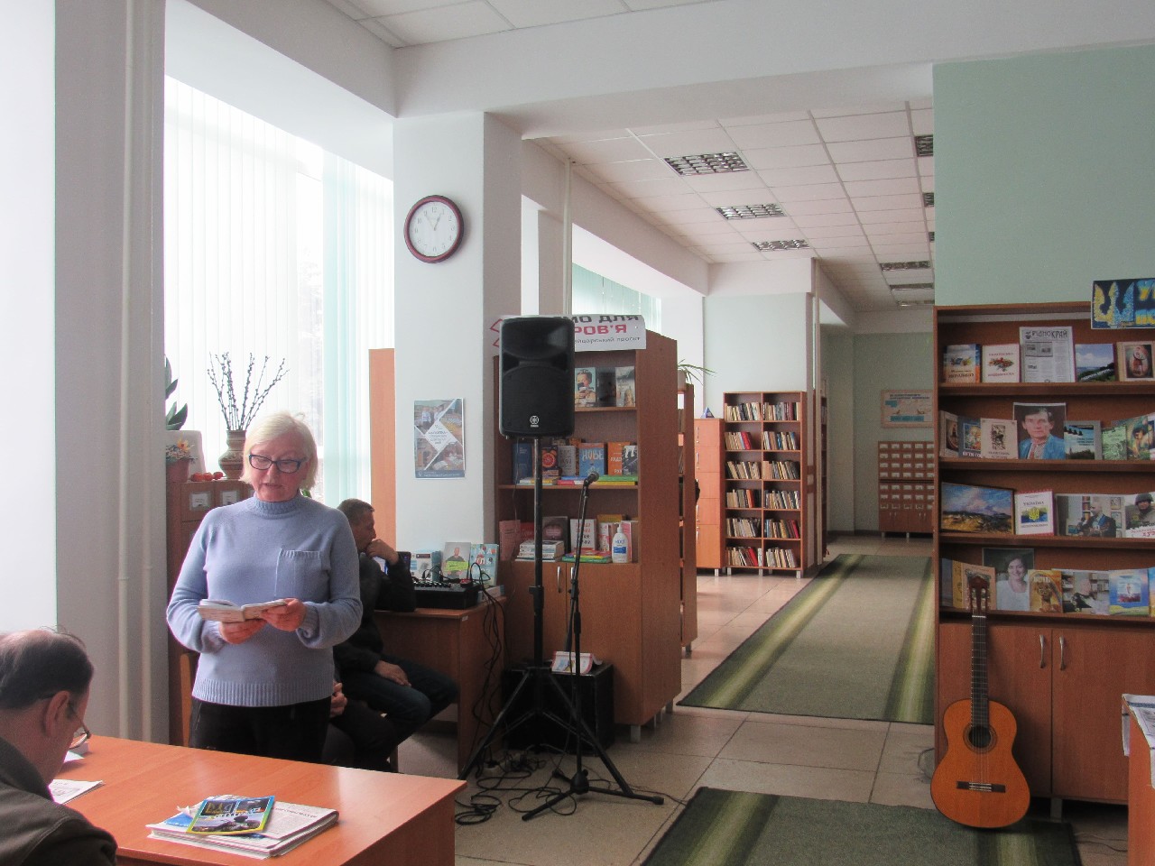 Олег Бородай порадував публіку патріотичними піснями гри на гітарі як власного авторства, так і на слова побратимів – військовослужбовців. Розповів і про фронт: воює зараз на Бахмутському напрямку. Поет, що стоїть на захисті України, подарував книгозбірні свою прозову книгу на воєнну тематику «Вогневий вал». Навзаєм завідувачка книгозбірні Світлана Голуб побажала йому подальшої плідної реалізації невичерпного творчого потенціалу.
