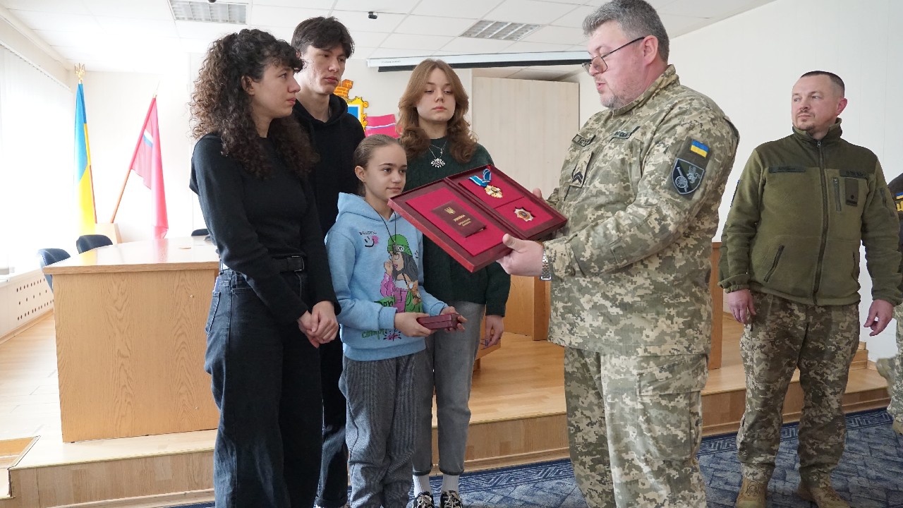 Вручали високу нагороду дітям та братові полеглого офіцер з управління в/ч А2943 Всеволод Казмірук та начальник відділу морально-психологічного забезпечення 87- го дивізіону Дмитро Власов.
