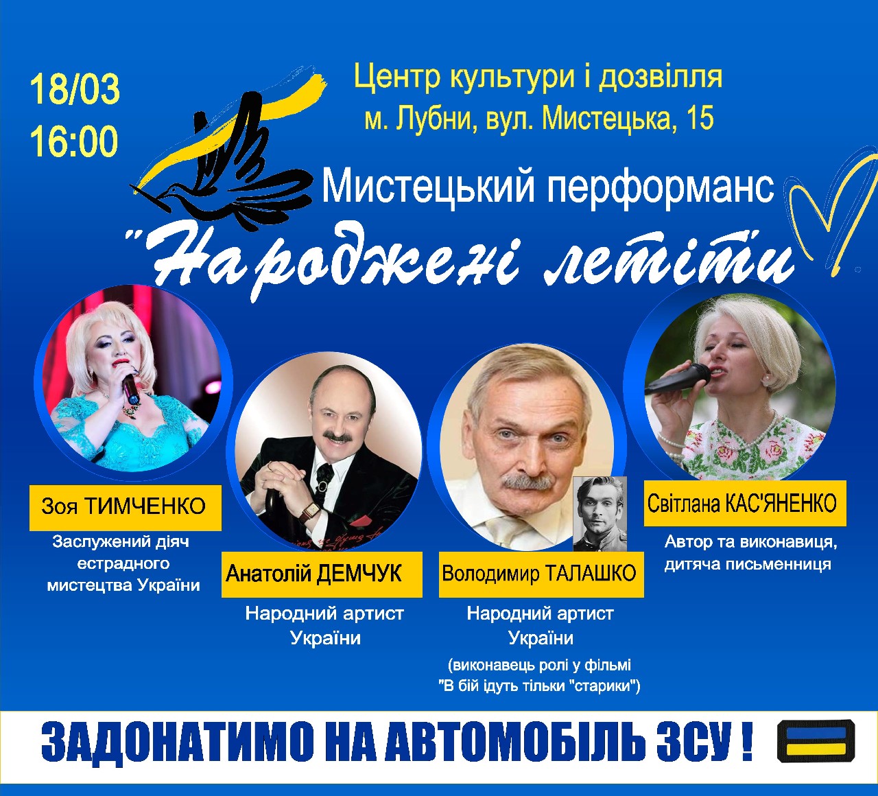 18 березня о 16 годині у Центрі культури і дозвілля (м.Лубни, вул. Мистецька,15) відбудеться мистецький перформанс на підтримку ЗСУ.