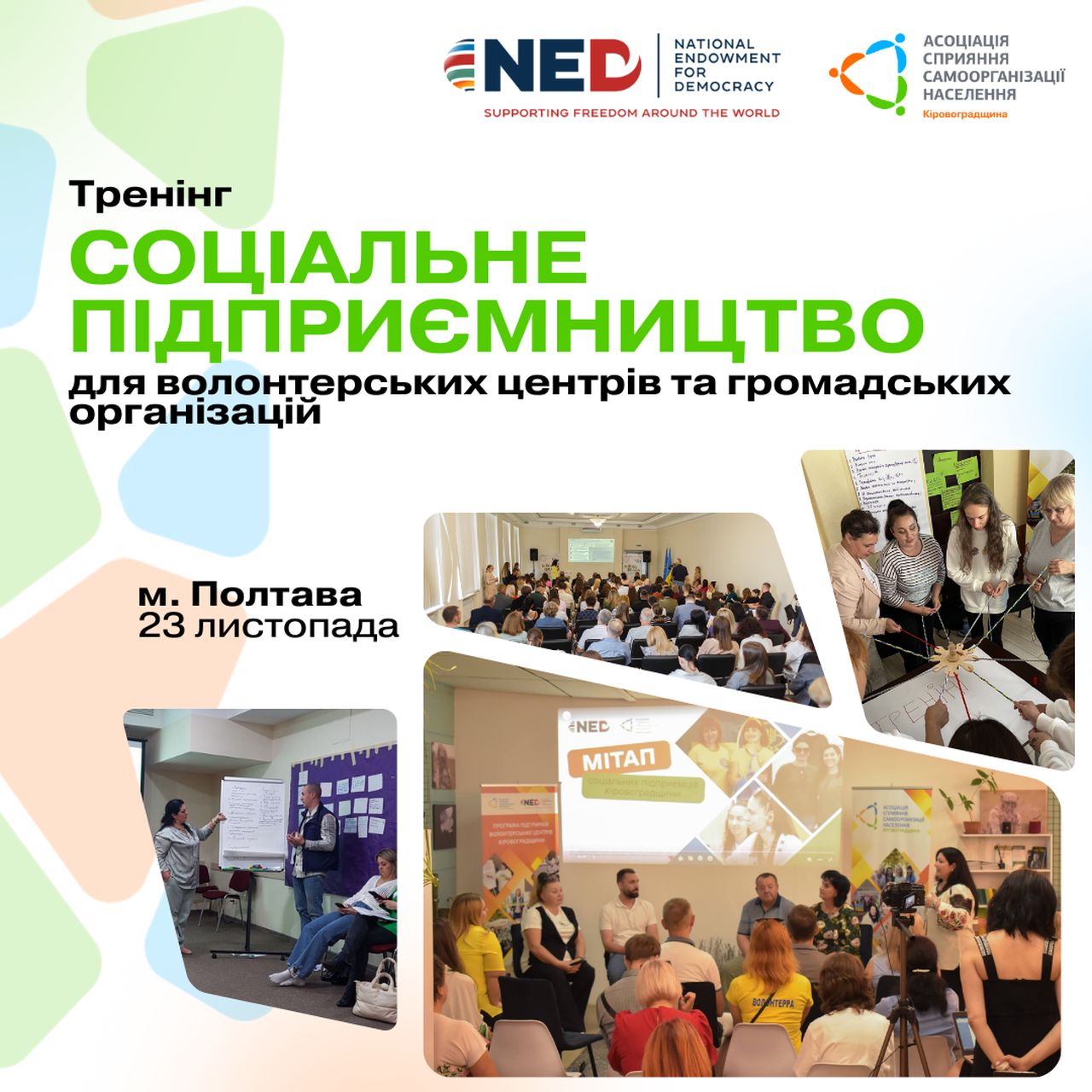 Тренінг відбудеться у м. Полтава 23 листопада. Початок об 11:00. Для учасників із інших населених пунктів передбачені компенсація проїзду та харчування.