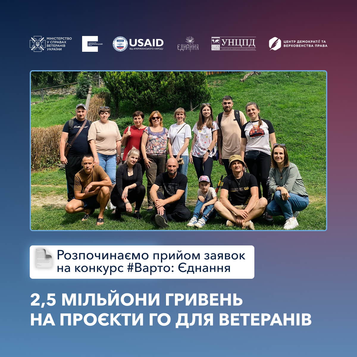 Громадські інституції, які працюють на підтримку ветеранів та членів їх сімей, зможуть отримати від 800 тис. грн до 2,5 млн грн фінансової підтримки у межах нового конкурсу "Варто: Єднання".