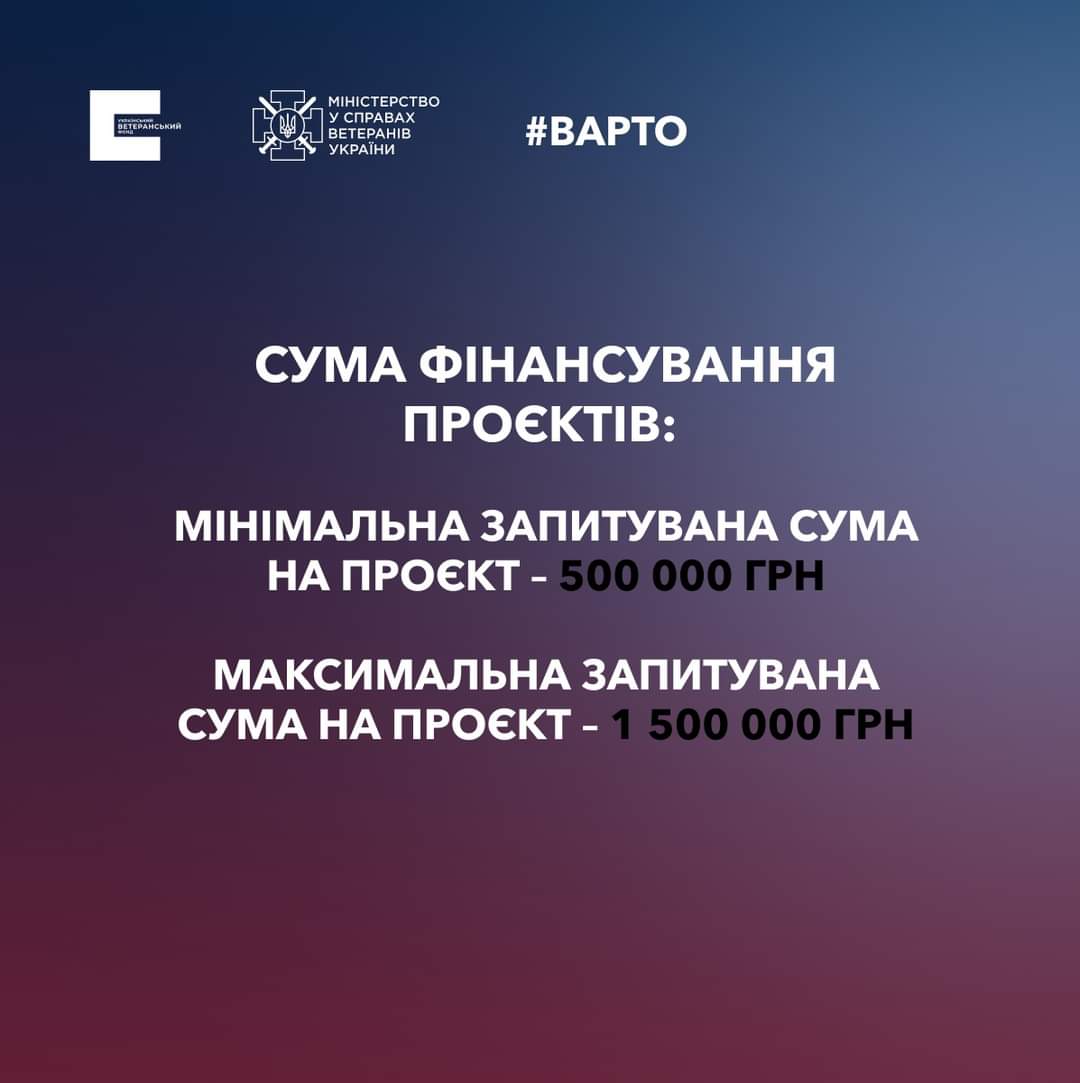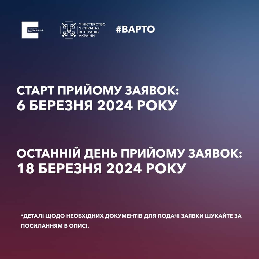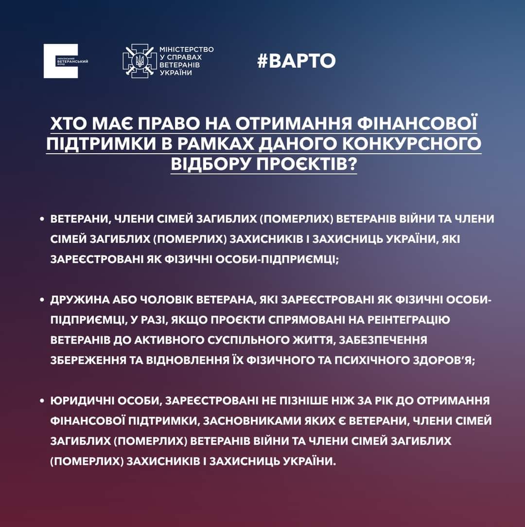 Більше про умови та покрокову інструкцію — на сайті Українського ветеранського фонду: https://veteranfund.com.ua/contests/varto-pochaty-vlasnu-spravu/